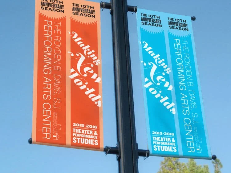 Georgetown's award-winning Davis Performing Arts Center sought a creative campaign worthy of its 10th Anniversary Season. The theme, 'Making New Worlds,' celebrated the transformative power of storytelling and set the stage for an exciting decade ahead. We used bold, provocative photography of cast and crew members to create a dynamic, collage-style series. The characters were shown breaking through graphic boundaries—a powerful metaphor for shattering the fourth wall between actors and audience.